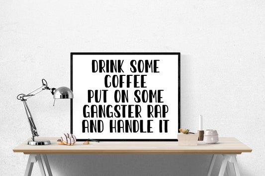 Funny Coffee Quote Art Print – Drink Some Coffee, Put on Some Gangster Rap and Handle It – Kitchen Home Decor – Living Room Poster