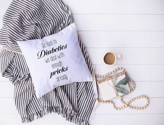 Diabetic Humor Throw Pillow – “Be Nice to Diabetics, We Deal with Enough Pricks” – 18x18 – Type 1 & Type 2 Diabetes Gift – Made in USA
