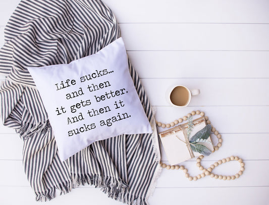 Life Sucks And Then It Gets Better | And Then It Sucks Again | Humor | Decorative Pillow | Custom Designed | Made In The USA