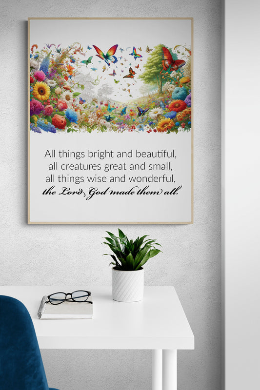 All Things Bright and Beautiful Art Print – Christian Wall Art with Flowers and Butterflies – Home Decor – Inspirational Hymn Quote Poster