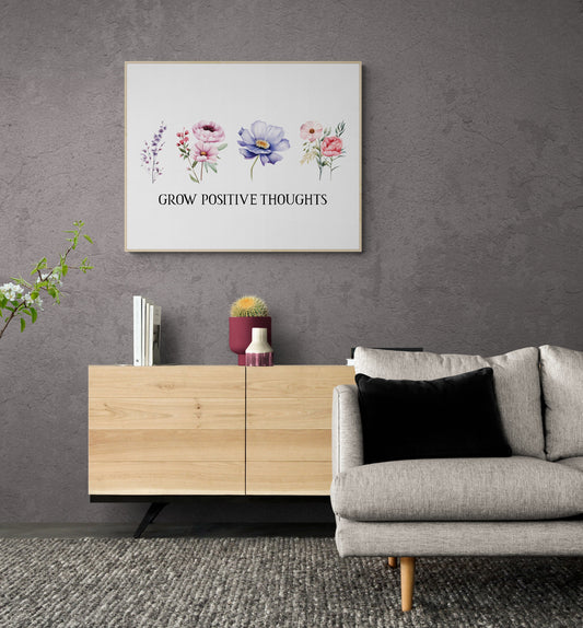 Inspirational Quote Art Print | Grow Positive Thoughts | Floral Watercolor | Home Decor | Poster