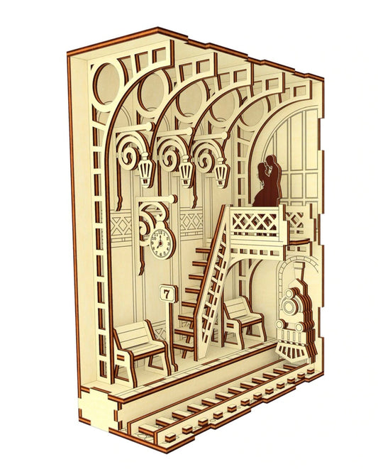 Railway Station With A Romantic Couple Scene | Assembly And Painting Required | Bookshelf Nook Insert